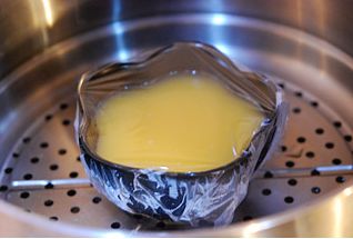 (盖上保鲜膜,用牙签在保鲜膜上扎几个孔。蒸锅内加水烧开,把碗放入蒸屉上,中小火约8分钟)